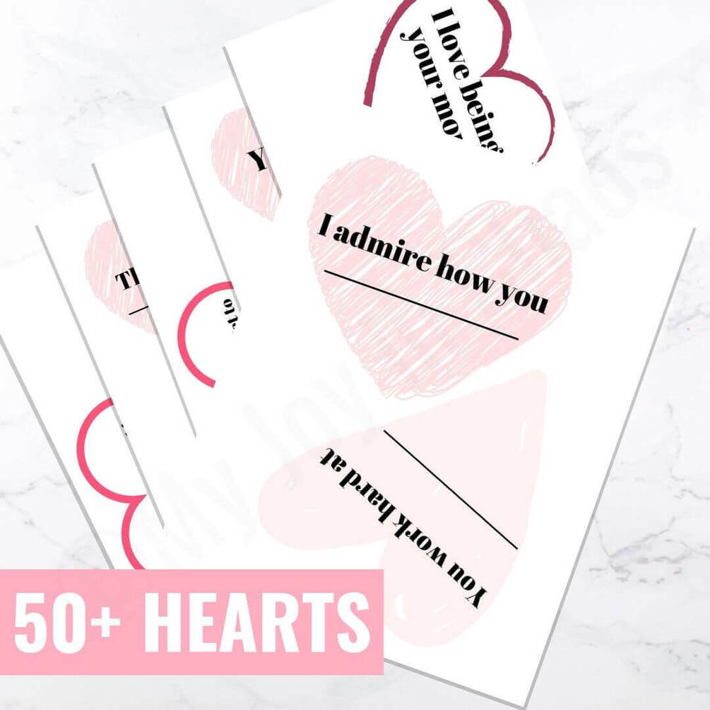 This printable pack contains 50 hearts in various sizes and styles. Some hearts are prewritten but others will allow you to personalize the compliment.